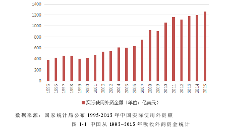 自從加入 WTO 后,中國的經濟進入快速發展的階段。隨著中國經濟進入調整階段,充分發揮民間資本與外來資本的作用已成為經濟體制改革的一個重要方式[1,2]。2012 年,中國吸引外資額全球第一。但外資持有公司股份的比例依然很低。因此,將來會有越來越多的外資以持股的方式進入中國。一方面,外國投資者投資中國股市多以價值投資為理念,為上市公司提供更好的經營理念、管理技術、人力資本并更好的監督公司運行;另一方面,由于外國投資者獲得國際信息渠道比國內投資者多,外國投資者對宏觀經濟變化敏感,外國投資者的逐利性致使外資資金的頻繁流動。外資股權的這種雙重性對上市公司產生的影響成為中國資本市場開放過程中必須回答的問題。 1978 年以來,我國開始實行改革開放,中國的經濟發展已進入了一個快速發展的新階段。吸引了大量境外資金往國內的流入。據國家統計局所發布的統計數據,2015 年中國實際使用外資額為 7813.5 億元人民幣,外資對中國經濟的發展起到了舉足輕重的作用。從上圖 1-1 中我們可以看到中國從 1995 年到 2015 年每年吸收外商直接投資的發展趨勢。中國吸收外商投資受國際經濟環境的影響,并不是逐年增加的,但總體趨勢是逐步增長。2015 年中國外商投資額比 1995 年的 3 倍還要多。自改革開放以來,中國的經濟得到了長足的進步和發展,同時隨著中國經濟政策的改變,中國經濟市場對外開放也會得到進一步提升,因此會促進國外資金向中國經濟市場的流動。 隨著中國對外資股權政策的進一步寬松,未來外資越來越多地會以股權投資的方式投資公司。2002 年 6 月,在國際證監會組織年會上,中國證監會主席周小川提出了 QFII 的概念。之后引進合格境外機構投資者論壇在深圳成功舉辦。自 2003 年以來,中國首次批準境外機構投資者投資中國股市,境外機構投資者獲批數量及投資額度增長速度飛速發展。在 2014 年底,獲得進入中國市場的境外投資機構的數量達到 274 家,與剛開始實行 QFII 制度時的境外投資者數量相比增長了 22 倍。而 2014 年獲批 669.23 億美元的投資額度與2003 年獲批的 17 億美元的投資額度相比,更是增長了 39 倍多。同時,外國投資者的類型也不再單一,變得多樣化。同時,隨著外資的增多,中國經濟受境外投資的影響也逐漸增大。