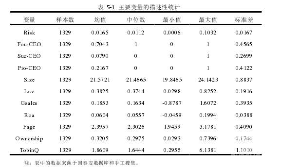 本文選取了 2010-2012 年滬深兩市 A 股 443 家上市家族企業的數據,共獲得 1329 個觀測值。根據 Excel 表格的匯總分析,截止到 2012 年底,1329 個觀測值中創始人擔任 CEO 的觀測值為 936 個(占比 70.43%),家族繼任者當任 CEO 的觀測值為 105 個(占比 7.90%),職業經理人擔任 CEO 的觀測值為 288 個(占比21.67%)。從中可以發現,我國大部分家族企業仍由創始人掌權,完成二代接班的企業只占 7.90%,這與《福布斯 2012 年中國家族企業調查報告》顯示的完成二代接班的家族企業占比 7%的結果較為接近。為了全面的了解樣本數據的特征,本文針對主要變量的樣本數、均值、中位數、最小值、最大值和標準差進行了描述性統計,描述性統計的結果如表 5-1 所示。樣本企業風險承擔水平的均值為 0.0165,中位數 0.0112,李文貴和余明桂(2012)研究我國滬深 A 股上市公司的風險承擔水平的均值為 0.0611,中位數為 0.0335。兩者相比不難發現,我國家族企業的風險承擔水平明顯低于我國上市公司的風險承擔水平,這也說明了我國家族企業確實存在著風險規避的傾向。家族企業的 CEO 來源,家族創始人 CEO(Fou-CEO)、家族繼任者 CEO(Suc-CEO)以及職業經理人 CEO(Pro-CEO)都是取值為 0 或 1的虛擬變量,其均值和 Excel 的統計結果一致,這里不再贅述。分析家族企業的企業規模均值為 21.5721,最小值和最大值分別為 19.8465 和 24.1423,標準差為0.8837,這表明在企業規模上各個家族企業存在著較大的差異。從資本結構來看,家族企業資本結構的均值為 0.3825,中位數 0.3744,低于我國上市公司負債率的一般水平,其原因可能是家族企業的融資相比國有企業更加困難,同時家族企業對資金的運用更為謹慎。家族企業的銷售增長、期初績效和上市年限三項指標與李文貴和余明桂(2012)研究結果基本一致。從家族所有權結構來看,家族所有權的均值為 0.3205,中位數為 0.2975,標準差為 0.1744,表明家族企業普遍重視對企業所有權的掌控。對于家族企業的發展情況可以通過托賓 Q 值看出,托賓 Q值的平均值為 1.8609,均值 1.6444,表明我國家族企業發展態勢良好,同時最小值和最大值分別為 0.2955 和 6.1381,標準差為 1.1010,也表明了家族企業的發展速度存在著明顯的差異。